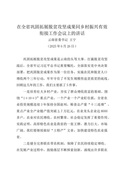 领导讲话:20250626在全省巩固拓展脱贫攻坚成果同乡村振兴有效衔接工作会议上的讲话——云南省委书记 王宁