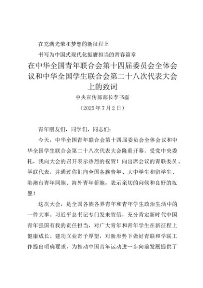 领导讲话:20250702在中华全国青年联合会第十四届委员会全体会议和中华全国学生联合会第二十八次代表大会上的致词——中央宣传部部长李书磊