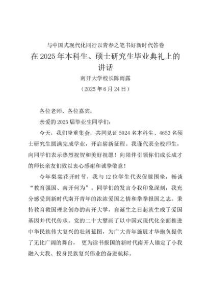 / 领导讲话:20250624在2025年本科生、硕士研究生毕业典礼上的讲话——南开大学校长陈雨露