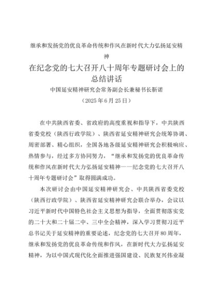 / 领导讲话:20250625在纪念党的七大召开八十周年专题研讨会上的总结讲话——中国延安精神研究会常务副会长兼秘书长靳诺