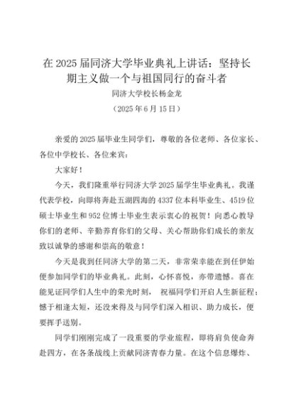 / 领导讲话:20250615在2025届同济大学毕业典礼上讲话——同济大学校长杨金龙