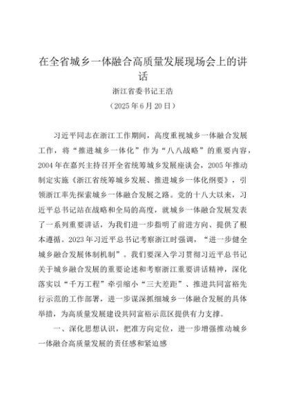 / 领导讲话:20250620在全省城乡一体融合高质量发展现场会上的讲话——浙江省委书记王浩