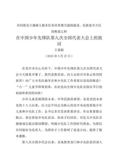 / 领导讲话:20250527在中国少年先锋队第九次全国代表大会上的致词——王嘉毅