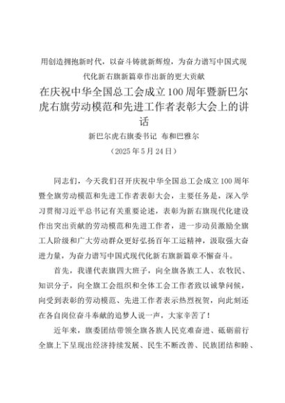 领导讲话:20250524在庆祝中华全国总工会成立100周年暨新巴尔虎右旗劳动模范和先进工作者表彰大会上的讲话——新巴尔虎右旗委书记 布和巴雅尔