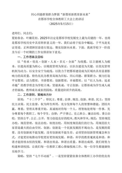 / 领导讲话:20250515在郡祁学校全体教职工大会上的讲话:同心同德群策群力梦圆“新郡祁新教育新未来”