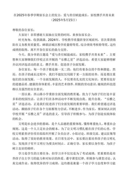 领导讲话:20250515在2025年春季学期家长会上的发言:爱与责任赋能成长,家校携手共育未来