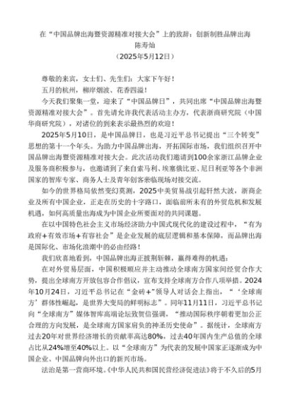 / 领导讲话:20250512陈寿灿:在“中国品牌出海暨资源精准对接大会”上的致辞:创新制胜品牌出海