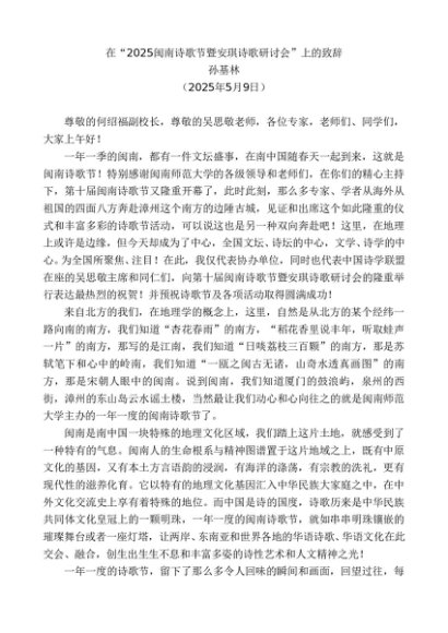 / 领导讲话:20250509孙基林:在“2025闽南诗歌节暨安琪诗歌研讨会”上的致辞