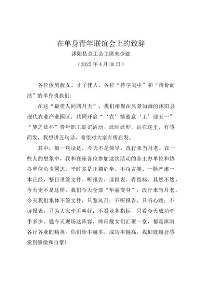 / 领导讲话:20250430在单身青年联谊会上的致辞——沭阳县总工会主席朱少建
