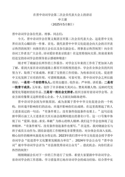 / 领导讲话:20250508申立康:在晋中诗词学会第二次会员代表大会上的讲话