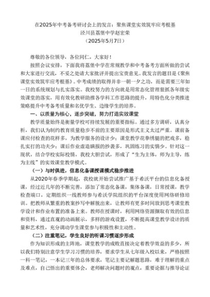 / 领导讲话:20250507泾川县荔堡中学赵宏荣:在2025年中考备考研讨会上的发言:聚焦课堂实效筑牢应考根基