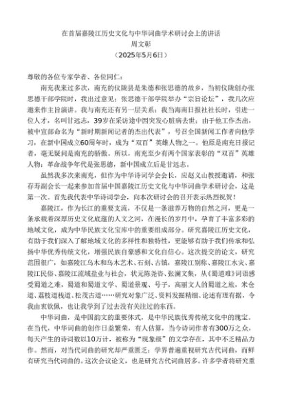/ 领导讲话:20250506在首届嘉陵江历史文化与中华词曲学术研讨会上的讲话