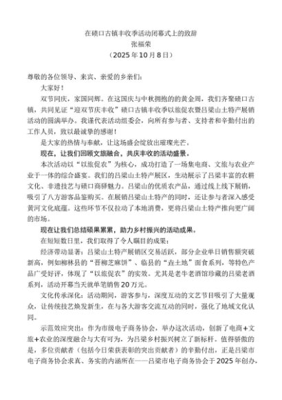 / 领导讲话:20251015张福荣:在碛口古镇丰收季活动闭幕式上的致辞