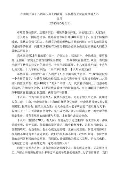 / 领导讲话:20250503汉风:在彭城书院十八周年庆典上的致辞:弘扬传统文化温暖世道人心