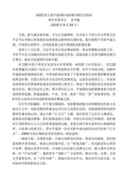/ 领导讲话:20251015晋中市委书记常书铭:2025第九届平遥国际电影展开展仪式致辞