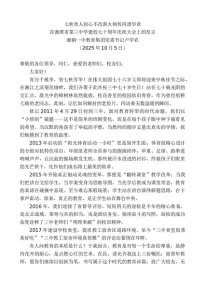 / 领导讲话:20251015湘钢一中教育集团党委书记卢学农:在湘潭市第三中学建校七十周年庆祝大会上的发言