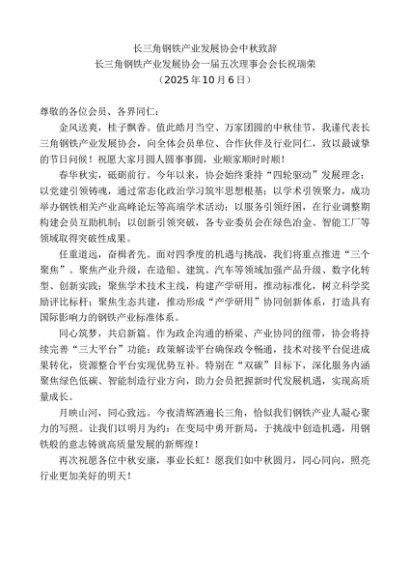 / 领导讲话:20251015长三角钢铁产业发展协会一届五次理事会会长祝瑞荣:中秋致辞