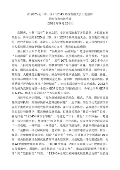 / 领导讲话:20251015烟台市市长张明康:在2025县(市、区)12345热线发展大会上的致辞