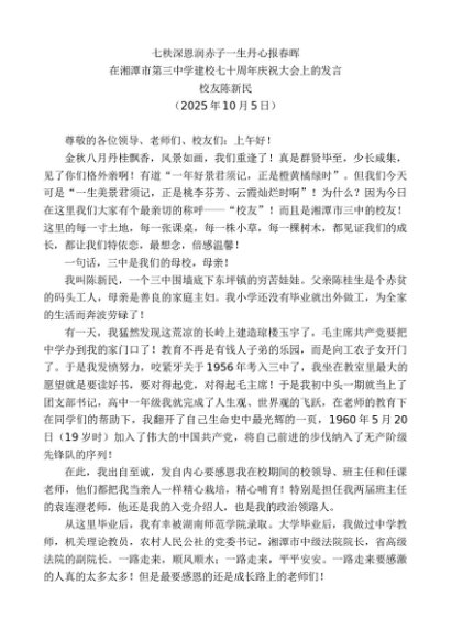 / 领导讲话:20251015校友陈新民:在湘潭市第三中学建校七十周年庆祝大会上的发言