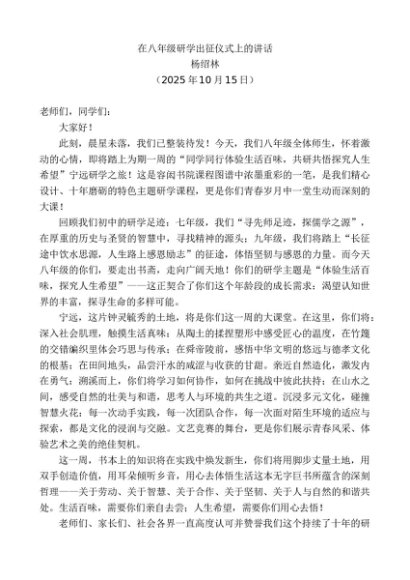 / 领导讲话:20251015杨绍林:在八年级研学出征仪式上的讲话