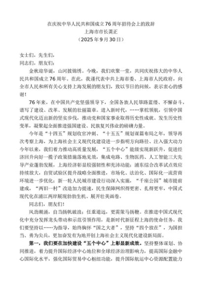 / 领导讲话:20251015上海市市长龚正:在庆祝中华人民共和国成立76周年招待会上的致辞