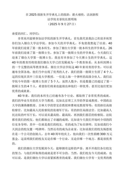 / 领导讲话:20251015法学院名誉院长郭明瑞:在2025级新生开学典礼上的致辞:薪火相传,法润新程