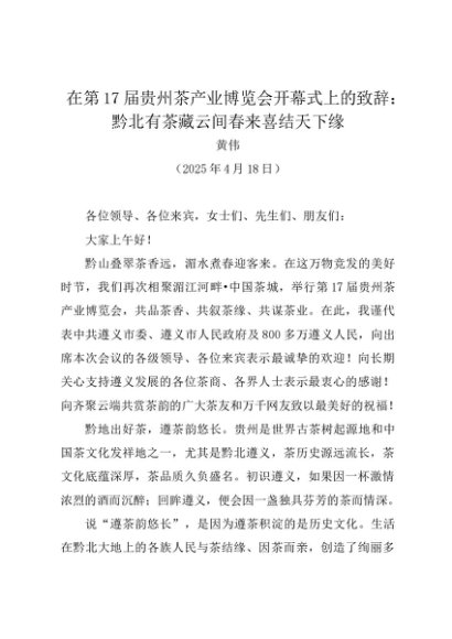 / 领导讲话:20250418在第17届贵州茶产业博览会开幕式上的致辞:黔北有茶藏云间春来喜结天下缘