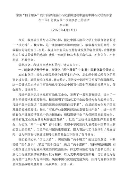 / 领导讲话:20250427李云鹏:在中国石化联五届二次理事会上的讲话:聚焦“四个服务”践行自律自强
