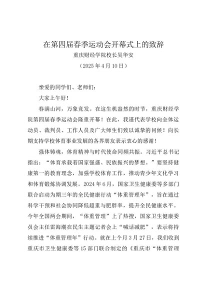 / 领导讲话:20250410在第四届春季运动会开幕式上的致辞——重庆财经学院校长吴华安