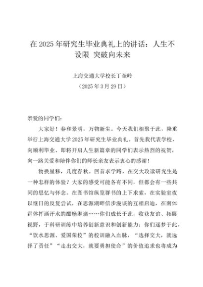 / 领导讲话:20250329在2025年研究生毕业典礼上的讲话:人生不设限 突破向未来——上海交通大学校长丁奎岭