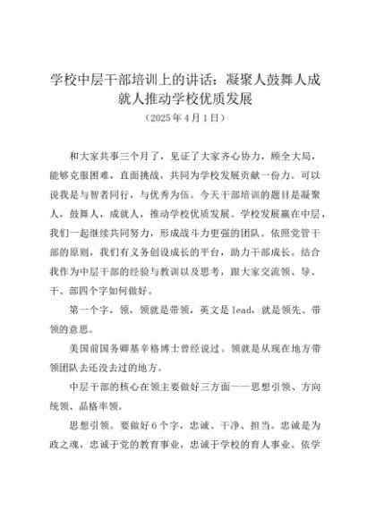 / 领导讲话:20250401学校中层干部培训上的讲话:凝聚人鼓舞人成就人推动学校优质发展