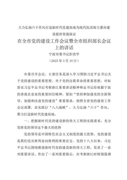 / 领导讲话:20250319在全市党的建设工作会议暨全市组织部长会议上的讲话——宁波市委书记彭佳学
