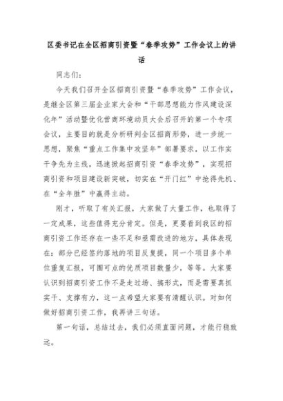 / 领导讲话:20250320区委书记在全区招商引资暨“春季攻势”工作会议上的讲话