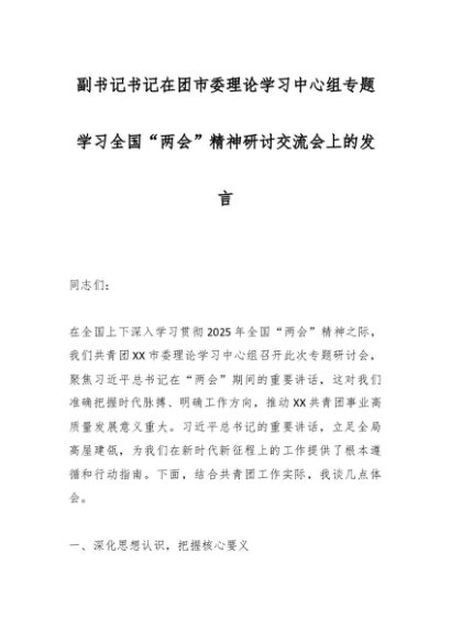 / 领导讲话:20250320副书记书记在团市委理论学习中心组专题学习全国“两会”精神研讨交流会上的发言