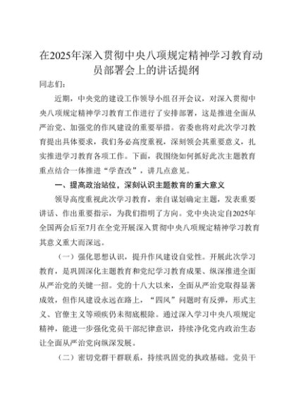 / 领导讲话:20250318在2025年深入贯彻中央八项规定精神学习教育动员部署会上的讲话提纲