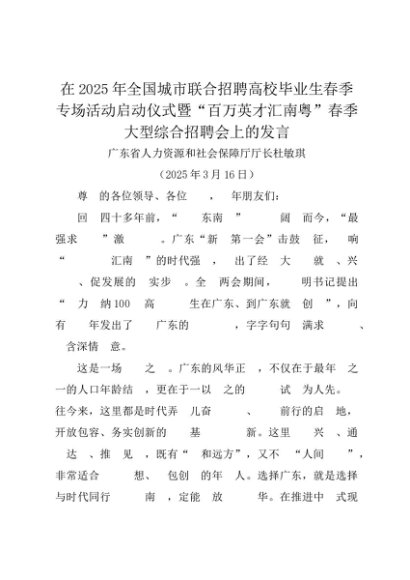 领导讲话:20250316在2025年全国城市联合招聘高校毕业生春季专场活动启动仪式暨“百万英才汇南粤”春季大型综合招聘会上的发言——广东省人力资源和社会保障厅厅长杜敏琪