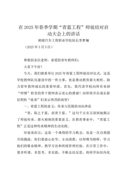 / 领导讲话:20250305在2025年春季学期“青蓝工程”师徒结对启动大会上的讲话——鹤壁汽车工程职业学院院长李梦翔