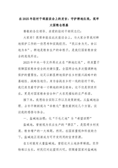 领导讲话:20250313在2025年驻村干部座谈会上的发言:守护耕地红线,筑牢大国粮仓根基