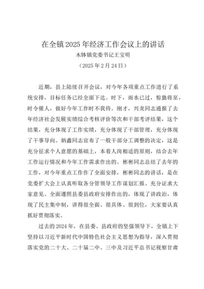 / 领导讲话:20250224在全镇2025年经济工作会议上的讲话——木钵镇党委书记王宝明