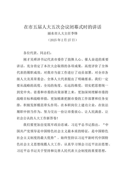 / 领导讲话:20250227在市五届人大五次会议闭幕式时的讲话——丽水市人大主任李锋