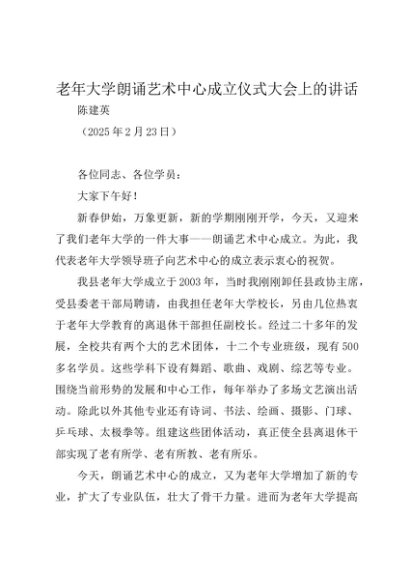 / 领导讲话:20250223老年大学朗诵艺术中心成立仪式大会上的讲话
