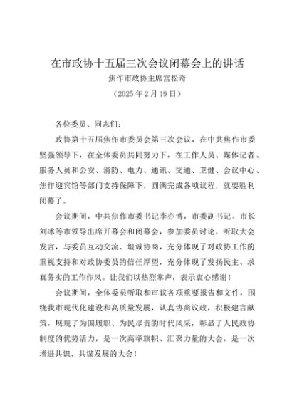 / 领导讲话:20250219在市政协十五届三次会议闭幕会上的讲话——焦作市政协主席宫松奇