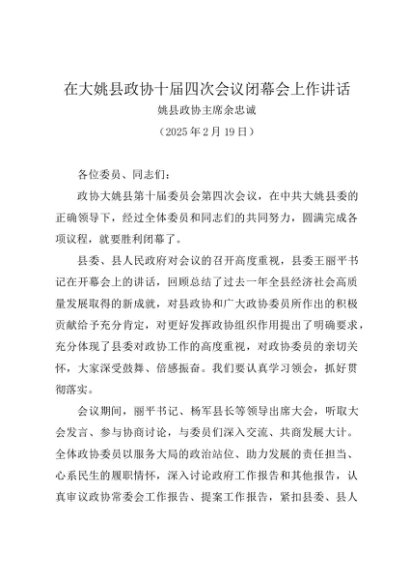 / 领导讲话:20250219在大姚县政协十届四次会议闭幕会上作讲话——姚县政协主席余忠诚