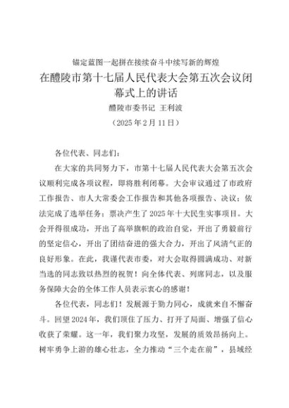 / 领导讲话:20250211在醴陵市第十七届人民代表大会第五次会议闭幕式上的讲话——醴陵市委书记 王利波