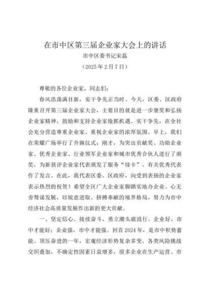 / 领导讲话:20250207在市中区第三届企业家大会上的讲话——市中区委书记宋磊