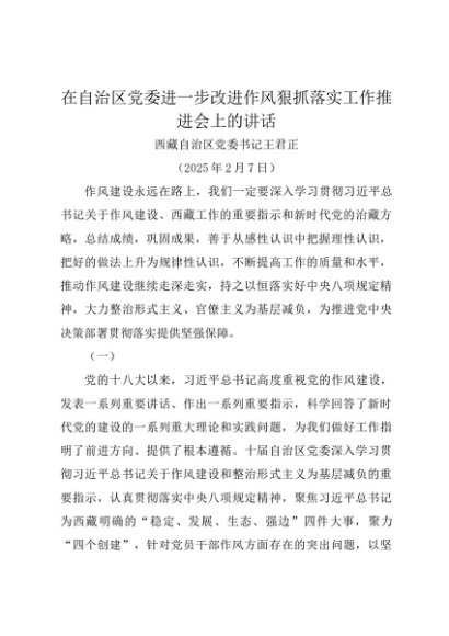 / 领导讲话:20250207在自治区党委进一步改进作风狠抓落实工作推进会上的讲话——西藏自治区党委书记王君正