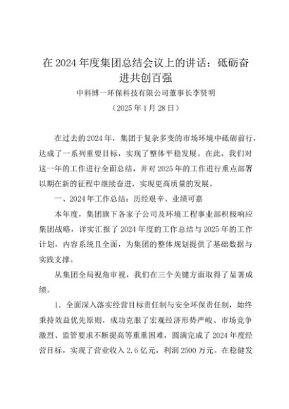 / 领导讲话:20250128在2024年度集团总结会议上的讲话:砥砺奋进共创百强——中科博一环保科技有限公司董事长李贤明