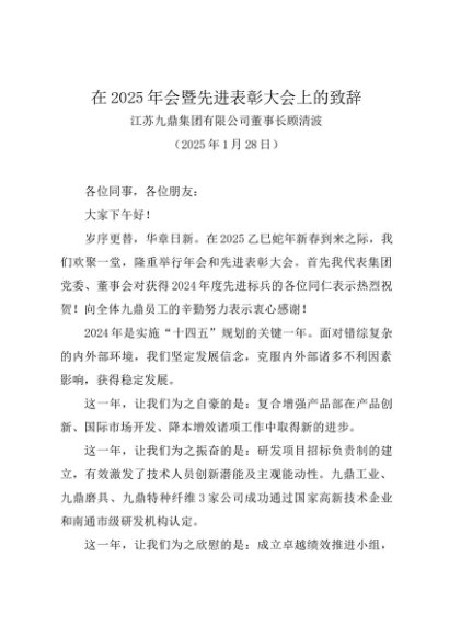 / 领导讲话:20250128在2025年会暨先进表彰大会上的致辞——江苏九鼎集团有限公司董事长顾清波