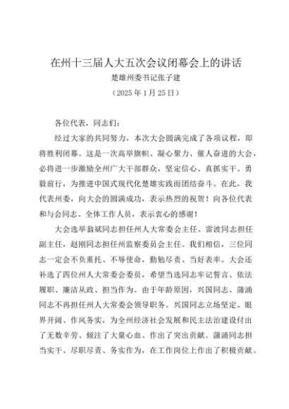 / 领导讲话:20250125在州十三届人大五次会议闭幕会上的讲话——楚雄州委书记张子建