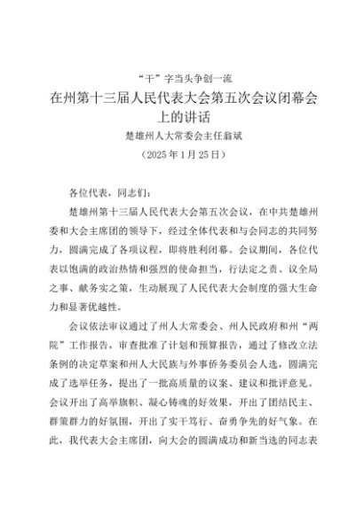 / 领导讲话:20250125在州第十三届人民代表大会第五次会议闭幕会上的讲话——楚雄州人大常委会主任翁斌